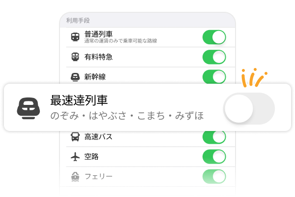 検索条件に「のぞみ・はやぶさ・こまち・みずほ」の項目が追加されます。オフにすると、こだまやひかりを使ったルートが検索できます。